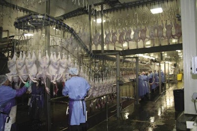 Dakota Provisions’ plant can slaughter, chill and debone 4 million head of heavy toms per year on one shift, and it was built to handle future growth. Dakota Turkey Growers’ farms will raise 5.6 million head of toms in 2006. Rutledge said that some of the colonies have contracts with other plants that will not expire until 2008, and that Dakota Provisions will process under 4 million head in 2006. Dakota Provisions has one, two-inspector evisceration line that is being operated under NTIS, but if the plant switches to HIMP, the plant could process as many as 5 million head on one shift. Two massive Morris chillers, each almost 150 feet long, are employed to chill the eviscerated carcasses below 40 F during their 4.5-hour trip through the chillers. Rutledge reports that the chillers and the rest of the raw side of the plant were engineered for possible implementation of HIMP and that the plant could ultimately process as many as 10 million head of toms per year. The further processing side of the plant was built so that it could be easily added on to, but it is sized to handle the volume generated by one shift of slaughter and deboning. The total square footage of the plant now stands at 150,000.