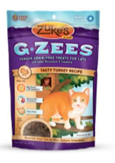 Z-Gees from Zuke's are grain-free treats for cats. The treats contain meat, fish oils, glucosamine and cranberries to help support mobility and urinary tract health. Z-Gees are available in both salmon and turkey flavors.