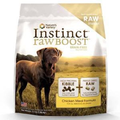 Nature's Variety offers Instinct Raw Boost kibble for both dogs and cats. This freeze-dried raw petfood with grain-free kibble is available in chicken, duck and venison for dogs, as well as chicken and duck for cats.