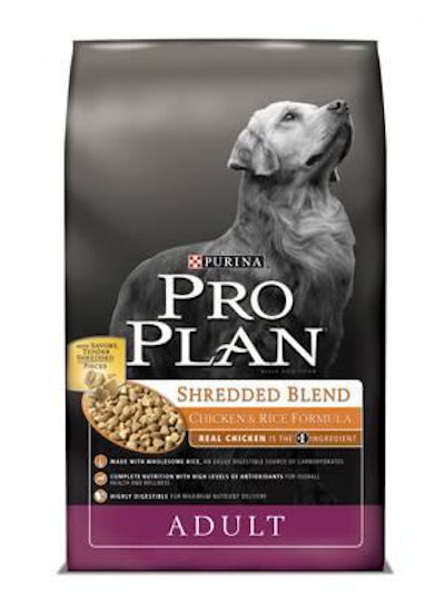 Nestlé's Purina PetCare Co. offers Pro Plan Shredded Blend Formula. The food is a mix of tender and hard kibble. The product line contains 85% savory hard kibble and 15% shredded pieces, according to the company. Formulas are: Beef & Rice, Chicken & Rice and Natural Lamb & Rice.
