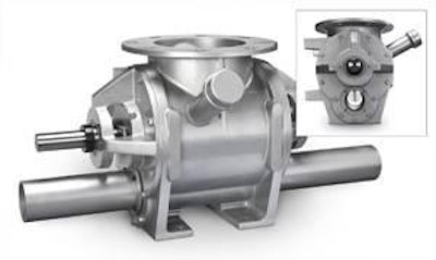 The BT series blow-through feeder/airlock from ACS Valves is designed to ensure optimal bulk density and throughput of hard-to-convey materials such as fine powders and flakes that, in high-pressure pneumatic conveying applications, can over-aerate and reduce material feed efficiency. The BT series 8-vane rotary valve design reduces air leakage and maximizes the flow path of air through the rotor pocket; improving material pocket release, according to the company. ACS Valves BT series blow-through feeder/airlock housings are available in cast iron, or 304 or 316 stainless steel; in either 8-inch or 10-inch round flange sizes. It is available with a hard chrome housing interior and with adjustable rotor tips.